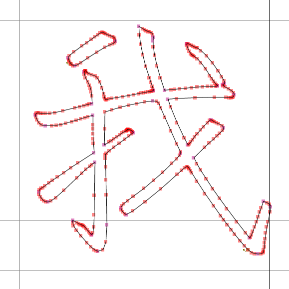 当前最常用的字体是ttf格式,其内部字形是矢量的,可以随意缩放(下图是本应用生成的矢量字体);从前常见的是像素字体,每种字号都要有对应的一个字形,否则缩放后很难看。
